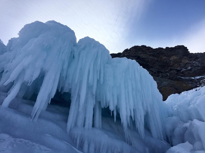 Недолгий переезд до Листвянки и вот встреча с седым Байкалом, затянутым в кристально прозрачные одежды, отороченные белоснежным мехом заснеженных хребтов!