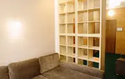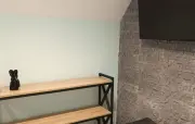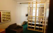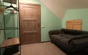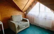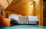 Однокомнатный мансардный номер: двуспальная кровать, диван, вешалка для верхней одежды, стеллажи, стол, стулья, банкетка, минихолодильник, чайник, набор посуды (для чая), телевизор.