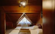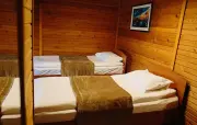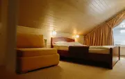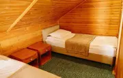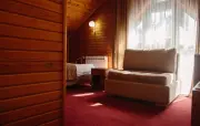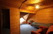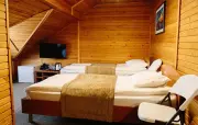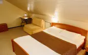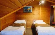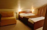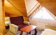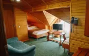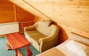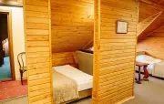 Однокомнатный номер с частично скошенным потолком, отделанный деревом: две односпальные кровати, диван, кресло-кровать, прихожая, шкаф для одежды, тумбочка, столик, зеркало, холодильник, чайник, посуда (для чая), сейф, телефон, телевизор.