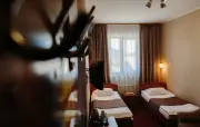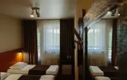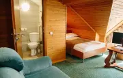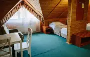 – Стандарт твин мансарда (1 номер). 1+1 основных места / 2 дополнительных места (предоставляются на диване). Однокомнатный номер с частично скошенным потолком, отделанный деревом: полутороспальная кровать, односпальная кровать, диван, прихожая, шкаф для одежды, тумбочка, столик, зеркало, холодильник, чайник, посуда (для чая), сейф, телефон, телевизор. Санузел: душ, раковина, зеркало, фен, средства гигиены (мыло, гель для душа, шампунь, тапочки), унитаз. Площадь номера: 27-30 кв.м.