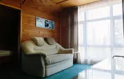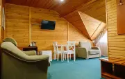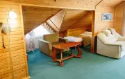 Однокомнатный номер с частично скошенным потолком, отделанный деревом: полутороспальная кровать, односпальная кровать, кресло-кровать, прихожая, шкаф для одежды, тумбочка, столик, зеркало, холодильник, чайник, посуда (для чая), сейф, телефон, телевизор.