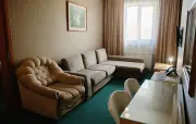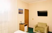 Однокомнатный номер: две односпальные кровати, диван, прихожая, шкаф для одежды, тумбочка, столик, зеркало, холодильник, чайник, посуда (для чая), сейф, телефон, телевизор.