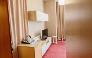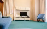 Однокомнатный номер: двуспальная кровать, кресло-кровать, шкаф для одежды, тумбочка, холодильник, чайник, набор посуды (для чая), сейф, телефон, телевизор.