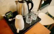 Однокомнатный номер: двуспальная кровать, шкаф для одежды, тумбочка, холодильник, чайник, набор посуды (для чая), сейф, телефон, телевизор.