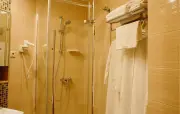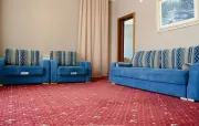 – Люкс (1 номер). 2 основных места / 3 дополнительных места (предоставляются на диване и еврораскладушке). Двухкомнатный номер с балконом. Гостиная: угловой диван, вешалки для верхней одежды, миникомод, журнальный столик, зеркало, холодильник, чайник, набор посуды (для чая), сейф, телефон, телевизор. Спальня: двуспальная кровать, шкаф для одежды, тумбочка. Санузел: душевая кабина, раковина, зеркало, фен, средства гигиены (мыло, гель для душа, шампунь), халаты, тапочки, унитаз. Площадь номера: 36,3 кв.м.