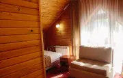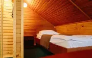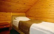 Однокомнатный номер с частично скошенным потолком, отделанный деревом: две односпальные кровати, кресло-кровать, прихожая, шкаф для одежды, тумбочка, столик, зеркало, холодильник, чайник, посуда (для чая), сейф, телефон, телевизор.