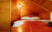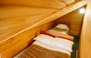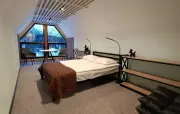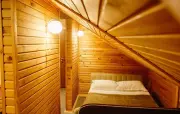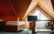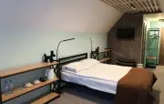 Однокомнатный номер на мансардном этаже, отделан деревом, с частично скошенным потолком и большим окном: полутороспальная кровать, кресло, вешалки для одежды, тумбочка, холодильник, чайник, набор посуды (для чая), сейф, телефон, телевизор.