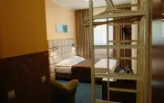 – Стандарт дабл мансарда (1 номер). 1+1 основных места / 0 дополнительных мест. Однокомнатный номер на мансардном этаже, отделан деревом, с частично скошенным потолком и большим окном: полутороспальная кровать, кресло, вешалки для одежды, тумбочка, холодильник, чайник, набор посуды (для чая), сейф, телефон, телевизор. Санузел: душ, раковина, зеркало, фен, средства гигиены (мыло, гель для душа, шампунь), унитаз. Площадь номера: 15.2 кв.м.