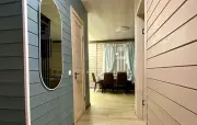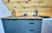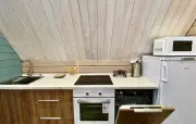 Кухня: кухонный гарнитур, холодильник, микроволновая печь, варочная панель, духовой шкаф, чайник, блендер, посуда и столовые принадлежности, стол, лавки.