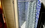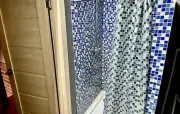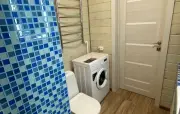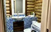 Санузел: душ, раковина, зеркало, стиральная машина, фен, унитаз.