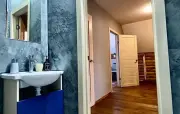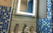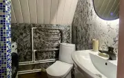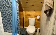 Санузел: душ, раковина, зеркало, фен, унитаз.