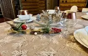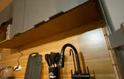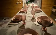 Кухня: кухонный гарнитур, холодильник, посудомоечная машина, варочная панель, духовой шкаф, микроволновая печь, чайник, тостер, посуда и столовые принадлежности, стол, лавки.