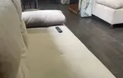 кухонная зона (холодильник, эл. плита, духовка, микроволновка, эл. чайник, раковина) с обеденным столом, стулья, комод, журнальный столик, пуфик, два дивана, камин