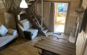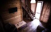 30 кв. м, 2-уровневый номер, гостиная на 1 этаже: гардеробная, диван, журнальный столик, стулья, телевизор, холодильник, чайник, спальня на 2 этаже: прикроватные тумбочки