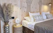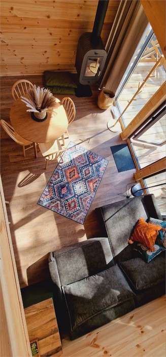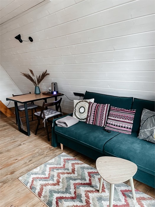 70 м.кв. 1 этаж: гостиная, стол, стулья, дровяной камин, диван, телевизор, кухонные тумбочки, мини-холодильник, раковина, чайная станция, набор посуды спальня: прикроватные тумбочки 2 этаж: прикроватные тумбочки терраса: шезлонги (номера могут отличаться друг от друга своей комплектацией)