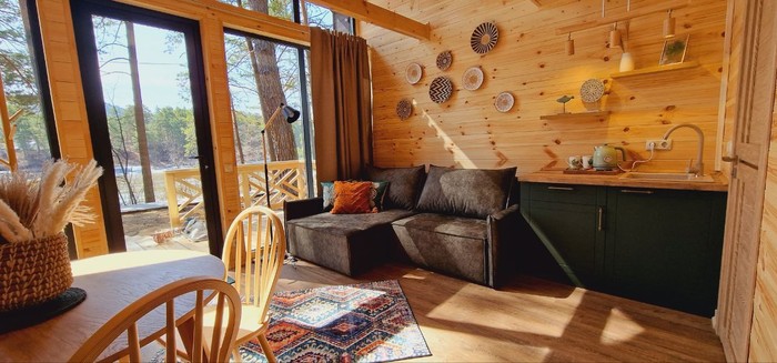 32 м.кв, прикроватные тумбочки, стол, стулья, камин, диван, телевизор, кухонные тумбочки, мини-холодильник, раковина, чайная станция, набор посуды, терраса (номера могут отличаться друг от друга своей комплектацией)