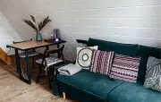35 м.кв. 1 этаж, письменный стол, столик, диван, пуфик, телевизор, мини-холодильник, чайная станция 2 этаж: спальня терраса: шезлонги, очаг/камин