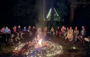 барбекю-пати в сосновом лесу в теплой компании друзей