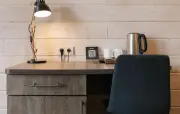 1 этаж, письменный стол, столик, диван, пуфик, телевизор, мини-холодильник, чайная станция