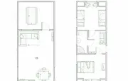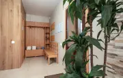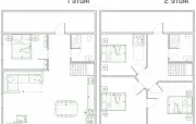 3 | две 2-спальные | 120 м2 1 этаж: гостиная, столик, диван, телевизор, стол, стулья, кухонная зона с варочной пнаелью, холодильник, микроволновка, раковина, чайник 2 этаж: две спальни: прикроватные тумбочки с бра, письменный стол, стул, в двух спальнях диван и телевизор, вешалки |