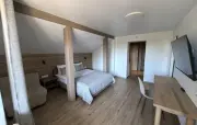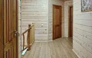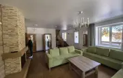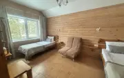 5 | три 2-спальные, две 1-спальные | 200 м2 1 этаж: гостиная, столик, диван, телевизор, стол, стулья, кухонная зона с варочной панелью, холодильник, микроволновка, раковина, чайник спальная комната: прикроватная тумбочка с бра 2 этаж: три спальни: прикроватные тумбочки с бра, письменный стол, стул, в двух спальнях диван и телевизор, вешалки |