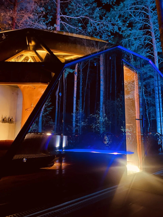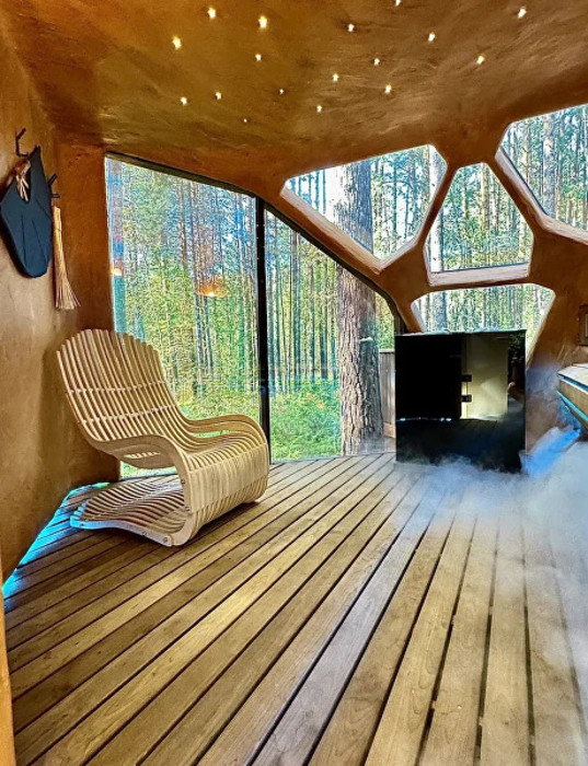 1 | 2-спальная кровать | 34 м2, панорамные окна, прикроватные тумбочки, мягкая мебель, столик, телескоп, кондиционер, теплый пол, телевизор, акустическая система, дополнительный отопительный конвектор, печь-камин, мини-холодильник, микроволновка, чайник, набор посуды в мангальной зоне - мангал, дрова, щепа для розжига, решетки для гриля, уличная мебель |