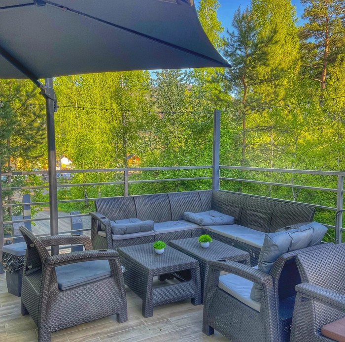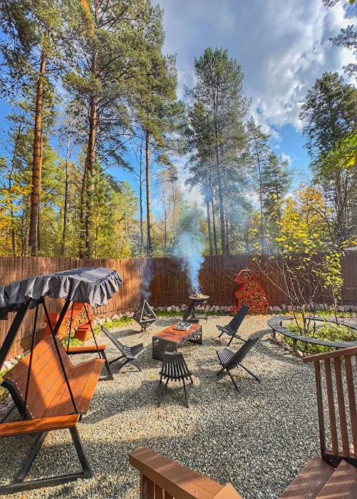2 | 2-спальная и диван | 55 м2, панорамные окна, , прикроватные тумбочки, шкаф, мягкая мебель, стол, кофейный столик, винный шкаф, кондиционер, теплый пол, телевизор, дополнительный отопительный конвектор, мини-холодильник, микроволновка, чайник, кофемашина, набор посуды в мангальной зоне - мангал, очаг-гриль, дрова, щепа для розжига, набор для барбекю, решетки для гриля, уличная мебель, качели с навесом, lounge-шезлонг из ротанга |