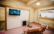 3 спальные комнаты: 2-спальная кровать, тумбочки, телевизор, санузел (туалет, умывальник, душ, фен, халаты), гостиная (2 эт.): диван, телевизор, стол, стулья, гостиная (1 эт.): оборудованная кухня, обеденный стол, мягкая зона, телевизор, баня: парная, фитобочка, душ, санузел