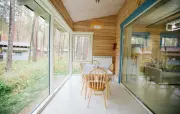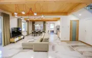 подогреваемые полы (во всех комнатах), застекленная веранда с плетеной мебелью, спальная комната: 2-спальная кровать, комод или тумбочка, гостиная: диван, гардеробная зона, кондиционер, стол, телевизор, холодильник, чайник, набор чайной посуды, чай, кофе, телефон