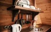 гостиная (кирпичная печь, диван, шкаф, кухонная зона с мойкой, шкафчиками, газовой плитой, набором посуды, обеденный стол, стулья, телевизор, мини-холодильник, печь-СВЧ, чайник, набор чайной посуды), спальная комната (тумбочки)