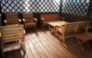 летняя кухня для самостоятельного приготовления пищи: плита, холодильник, набор посуды, столы, скамейки, стулья, 5 посадочных мест