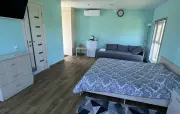 1 | 2-спальная, два 1-спальных дивана | 46 м2, прикроватные тумбочки, вешалка, комод, кресло, диваны, телевизор, мини-холодильник, чайник, выход на террасу | туалет, умывальник, душевая кабина, фен | раскладуш-ка | |