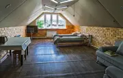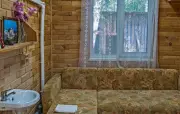 3-этажный коттедж на 5 номеров(зимой – печное отопление) общий холл 1 этажа:телевизор, холодильник, чайник, микроволновая печь, набор посуды, стол, стулья, диван общий холл 2 этажа:зона отдыха с креслами и диванами, стол, стеллаж с книгами, гладильная доска |