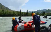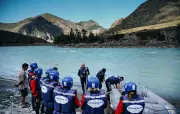 Начало водной части маршрута. Инструктаж по техники безопасности на воде, правила пользования водным снаряжением. На водной части сплава по реке Чуя с группой идет машины сопровождения, для перевозки основного груза, таким образом все пороги проходятся не груженными лодками.